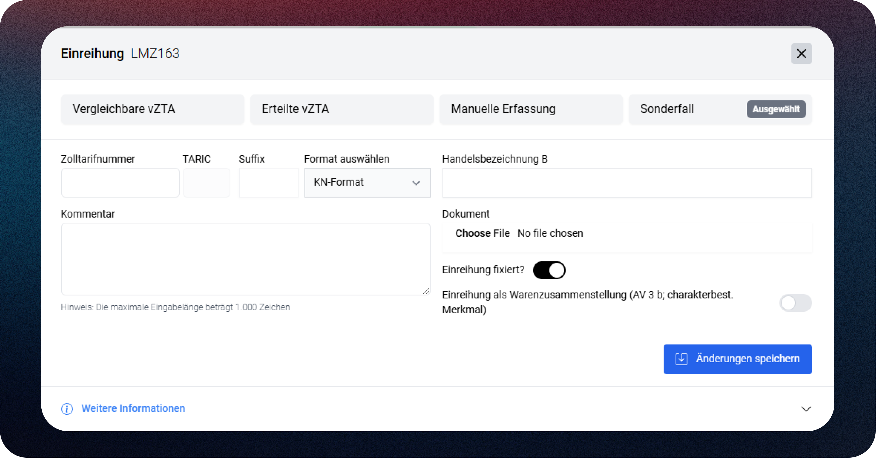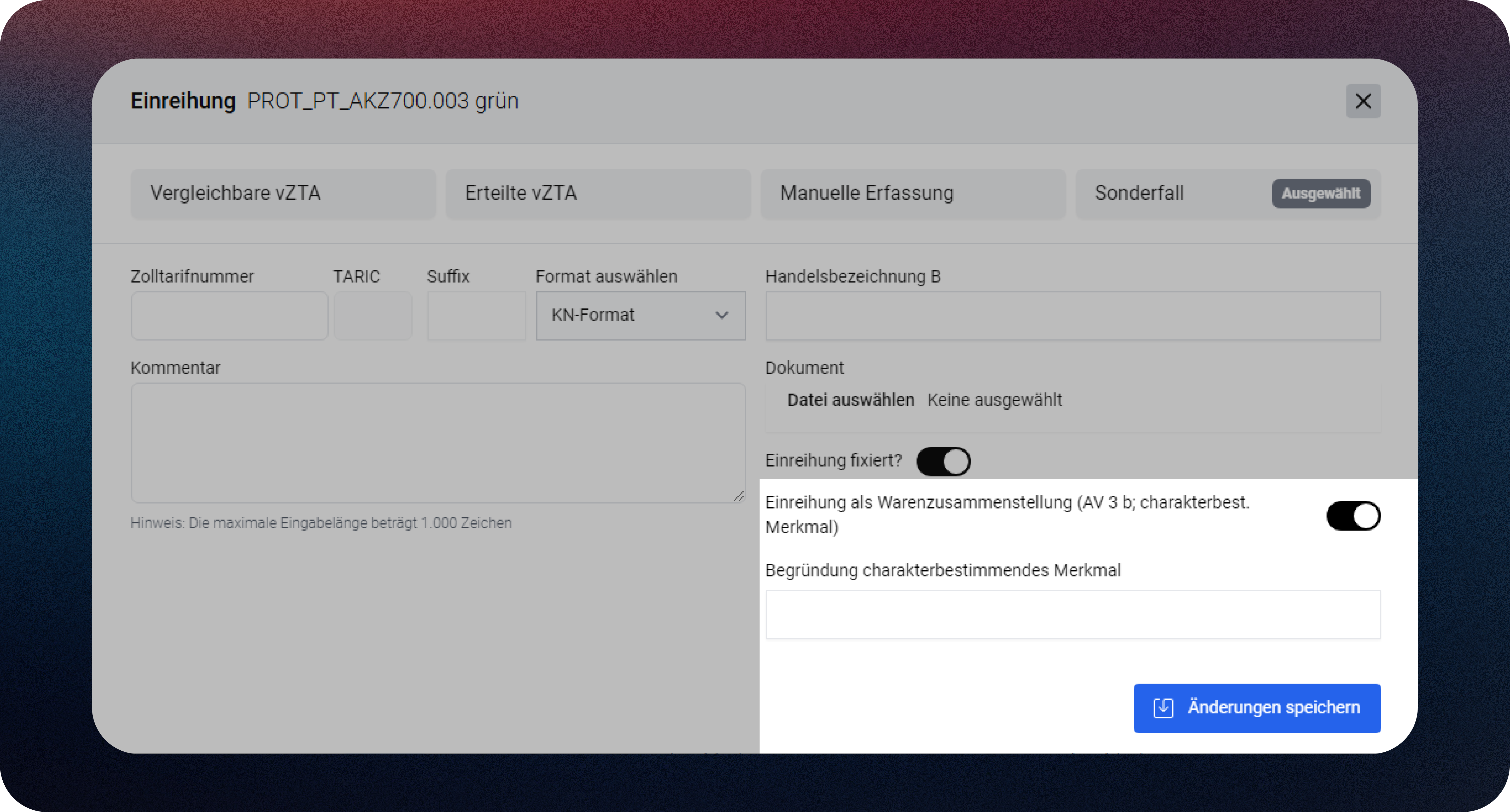 If the customs administration assigns you a customs tariff number, for example, as a result of an inspection, an external audit, or a customs examination report, you can use this section to record and document the entire process. This functionality ensures that specific cases where the customs authority has determined the classification of goods are properly tracked and stored for compliance purposes. Make sure to include all relevant details, such as the customs tariff number provided, the date of assignment, and any associated documentation or remarks from the customs authority.