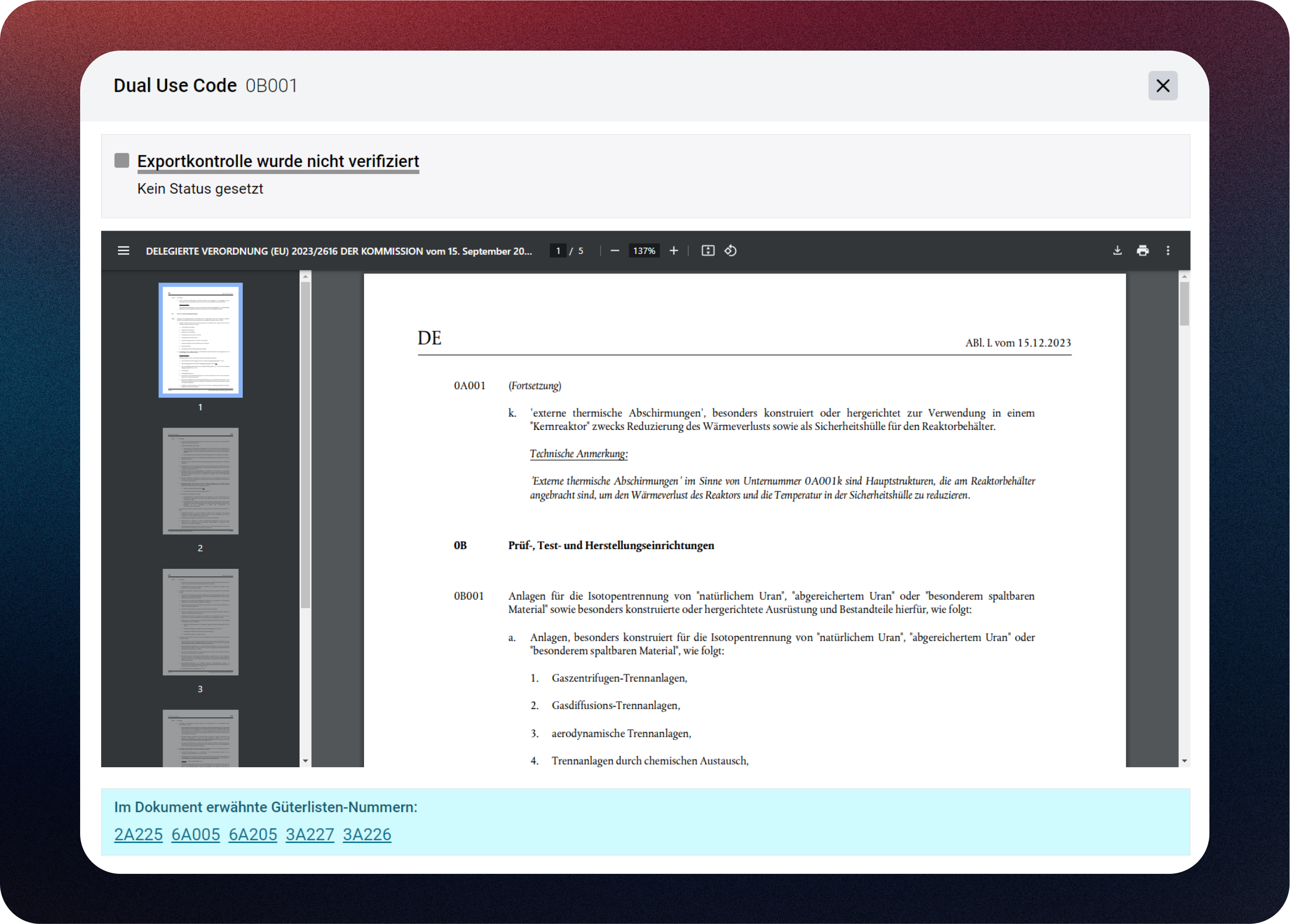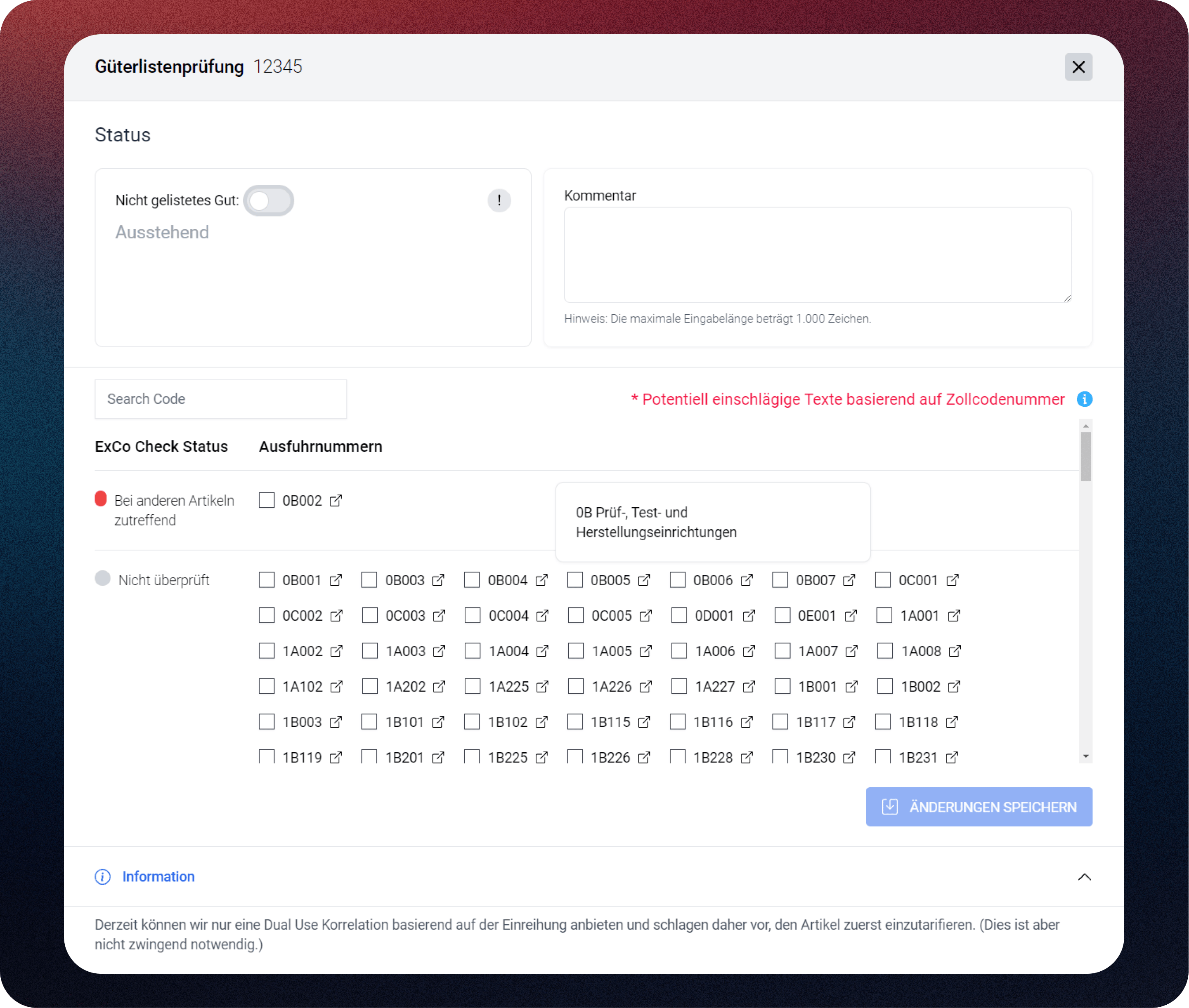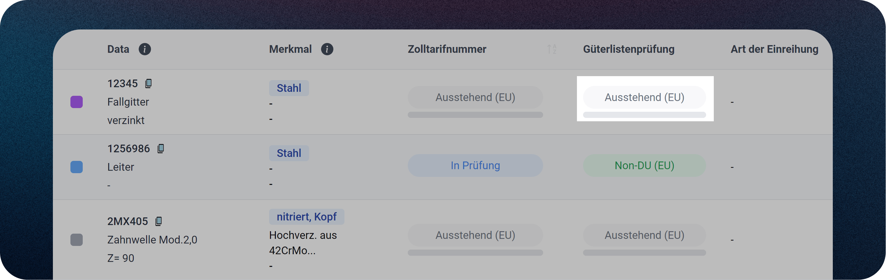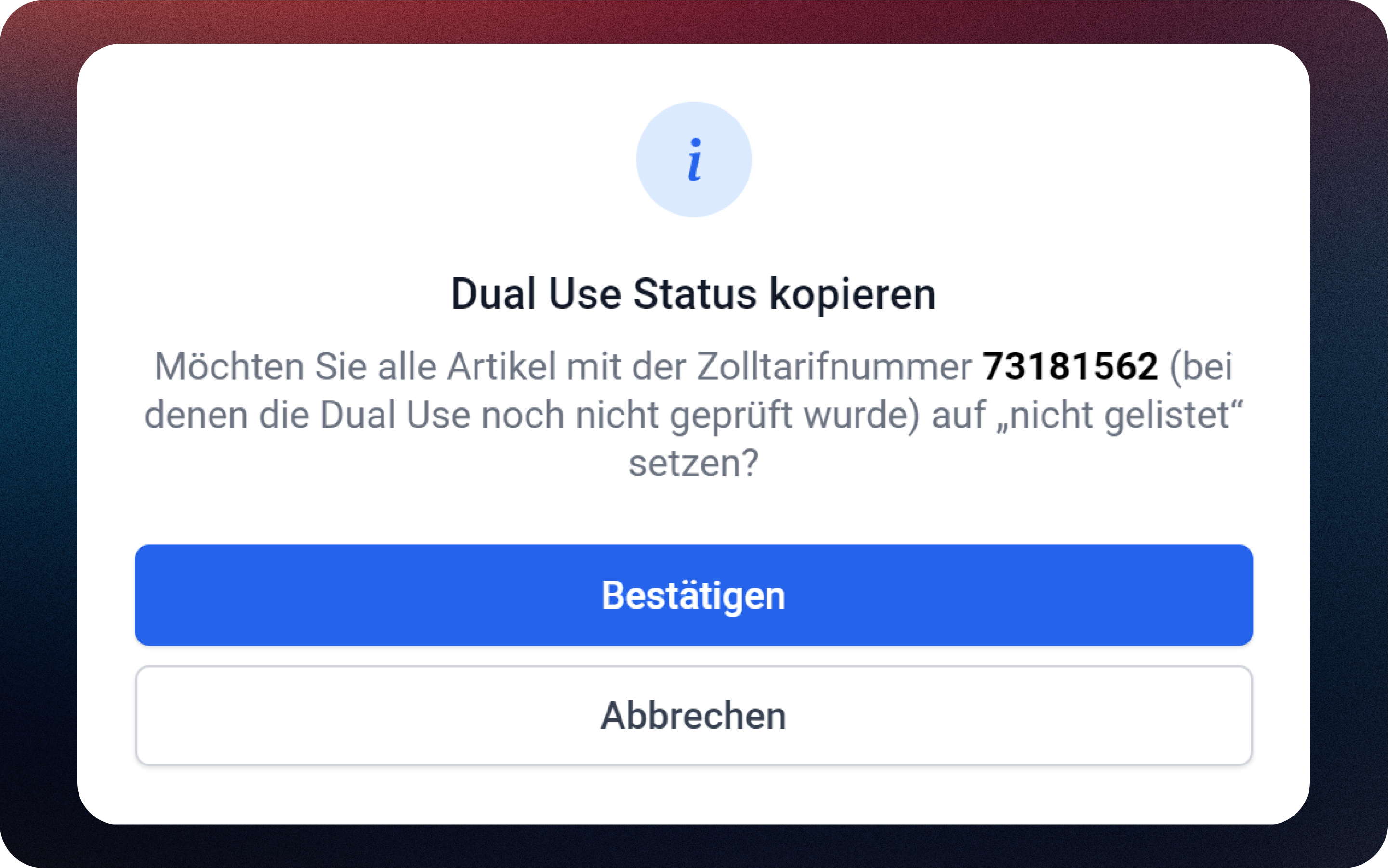 For optimum use of the processes in the CU-TA software, the check for dual-use goods should take place after classification. However, this is not absolutely necessary. The decision as to whether a product is a dual-use good or not can also be checked and stored before classification.