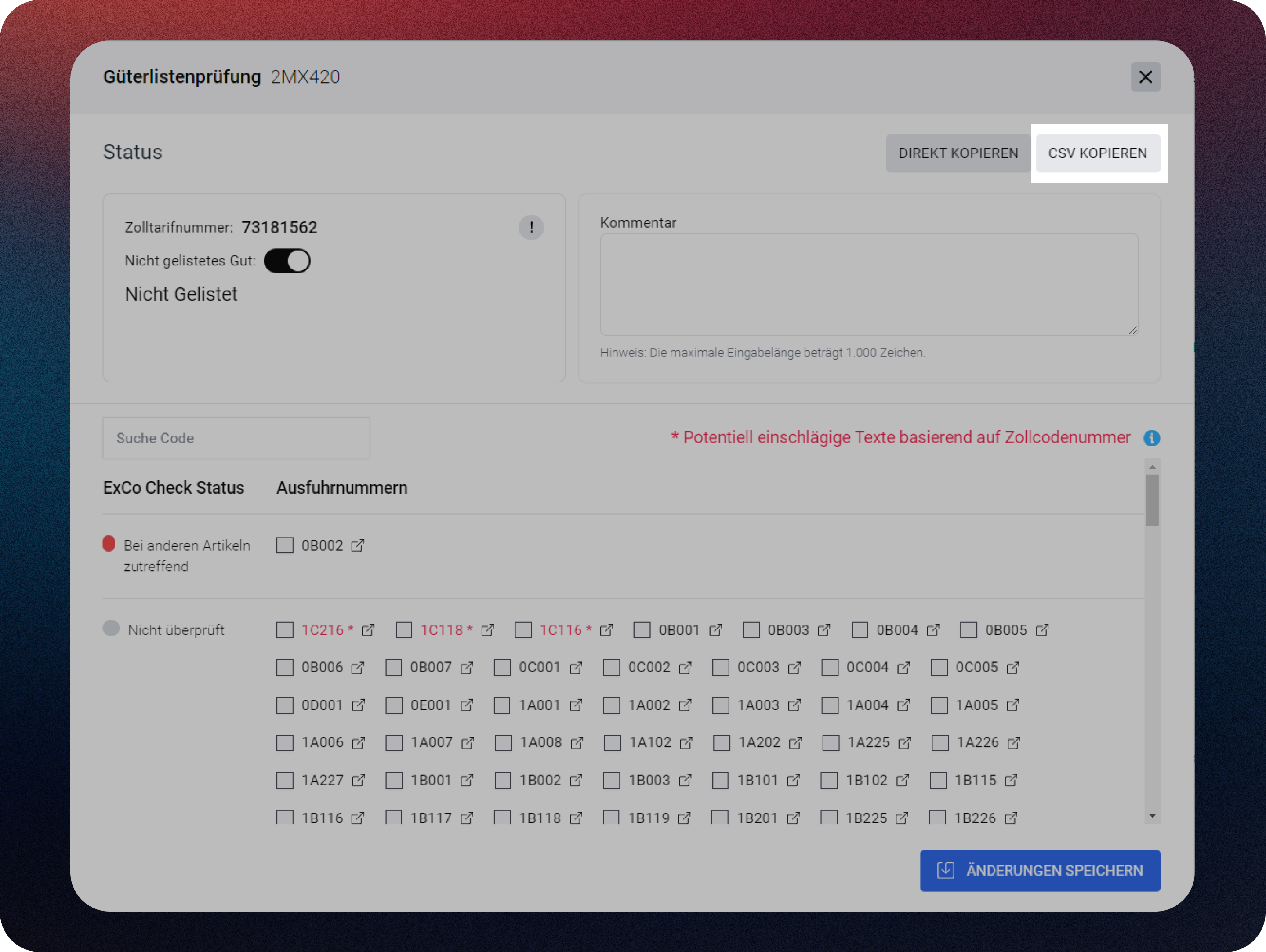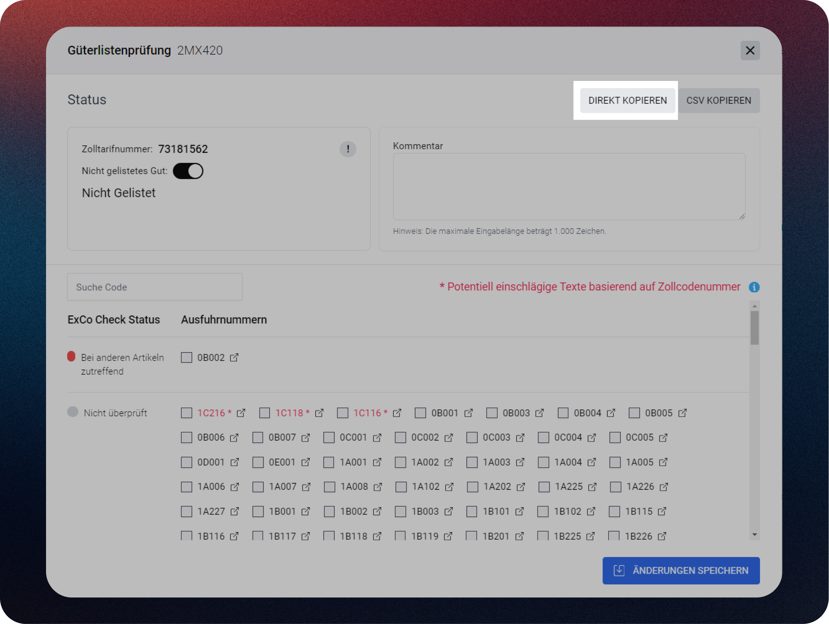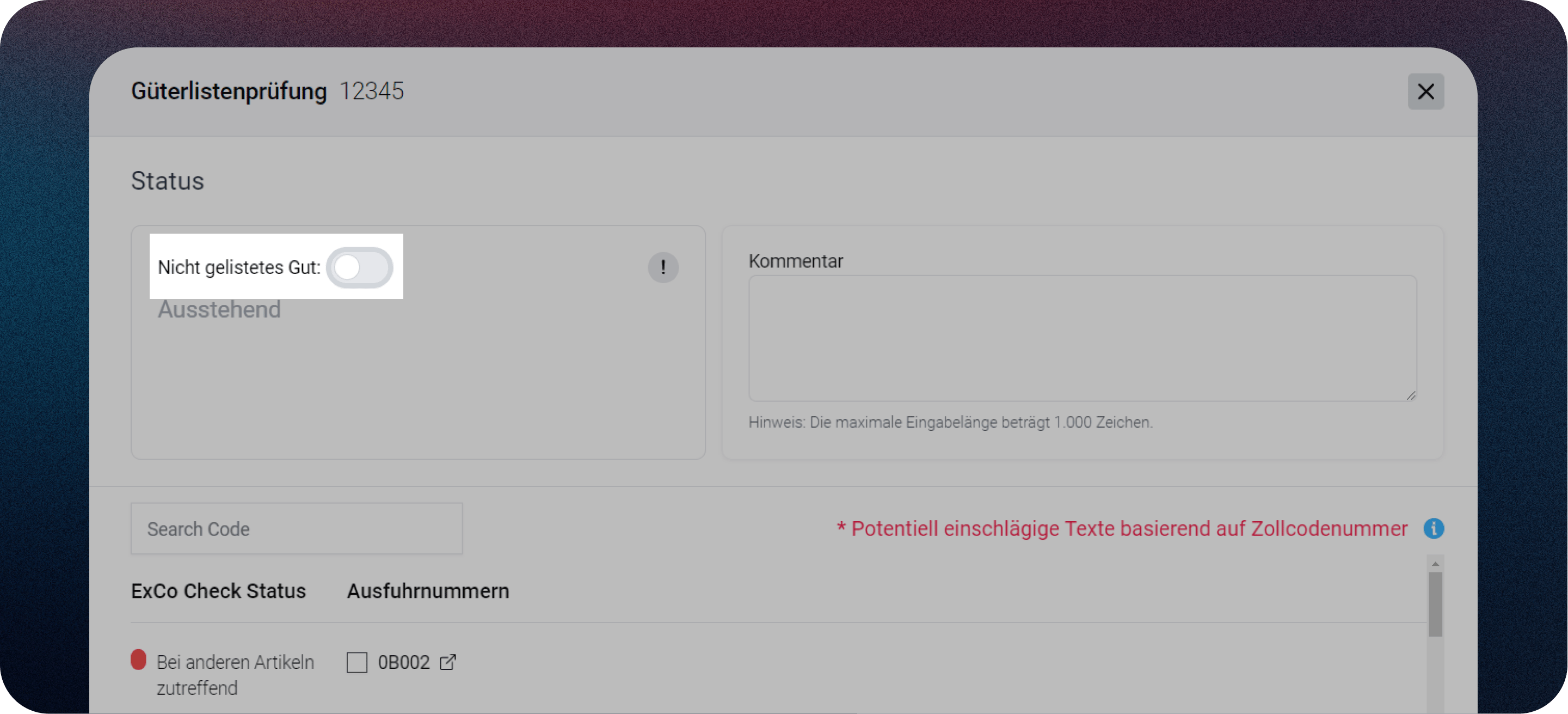 The goods list texts of the corresponding legal group are displayed in the lower part of the screen. If you have made a pre-filtering in the Export control module, these goods list texts are split according to this pre-filtering.